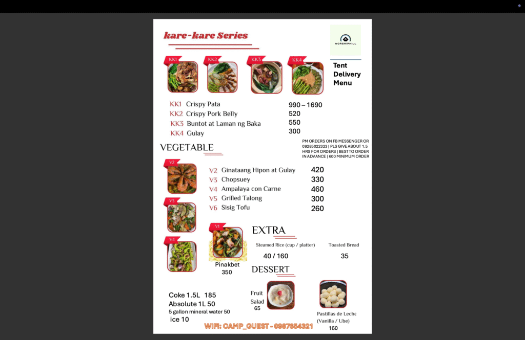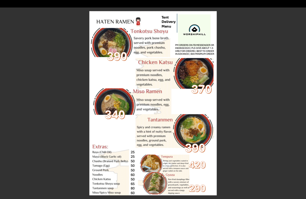 With every order delivered directly to your tent or kubo, you’ll experience the ease of dining without leaving your spot. Whether you’re a family sharing pancit under the trees, youth groups slurping ramen after worship, or friends laughing over sisig and rice, our Tent Delivery Menu turns every meal into a moment of connection. At Worshiphill, food is more than nourishment — its fellowship served on a plate. OPEN FROM 10:30AM – 630PM LAST ORDER