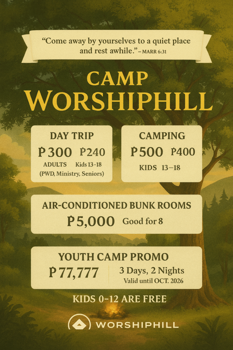 Camp Worshiphill is a Christian campground located in the serene hills of Lian, Batangas, where the beauty of God’s creation meets the joy of fellowship. Spread across 14.3 hectares with over 350 mango trees and elevated trails reaching 200 meters above sea level, Worshiphill offers a unique space for retreats, worship gatherings, family camps, and outdoor adventures.