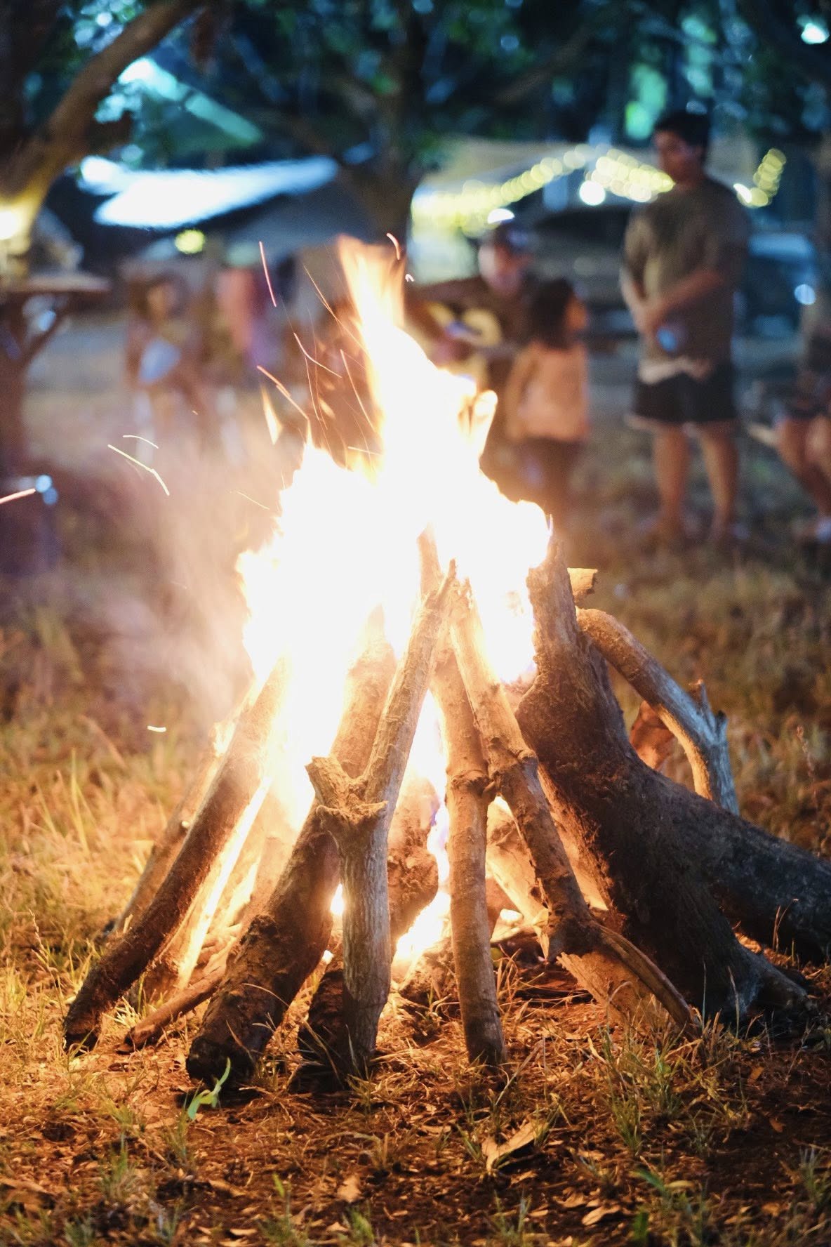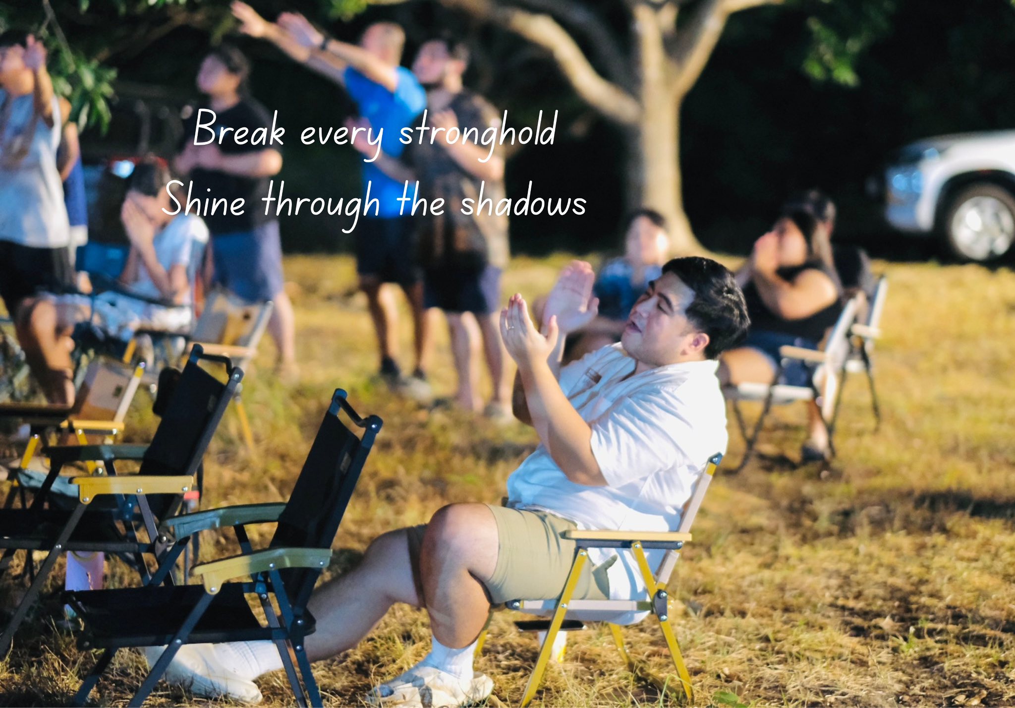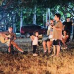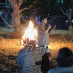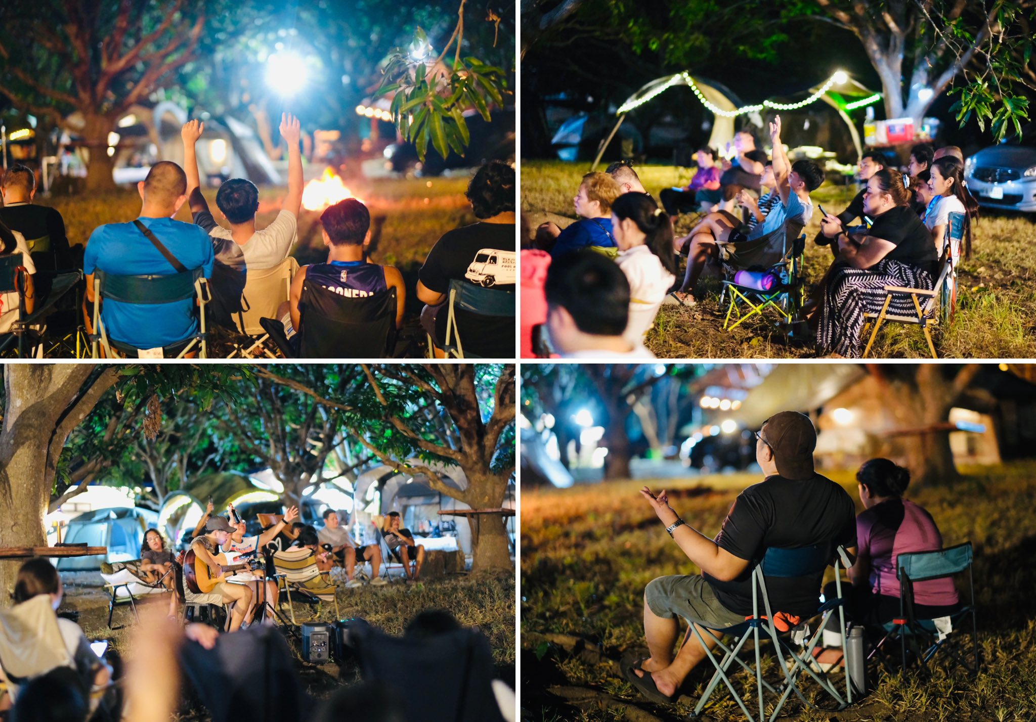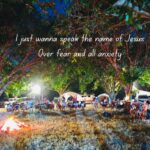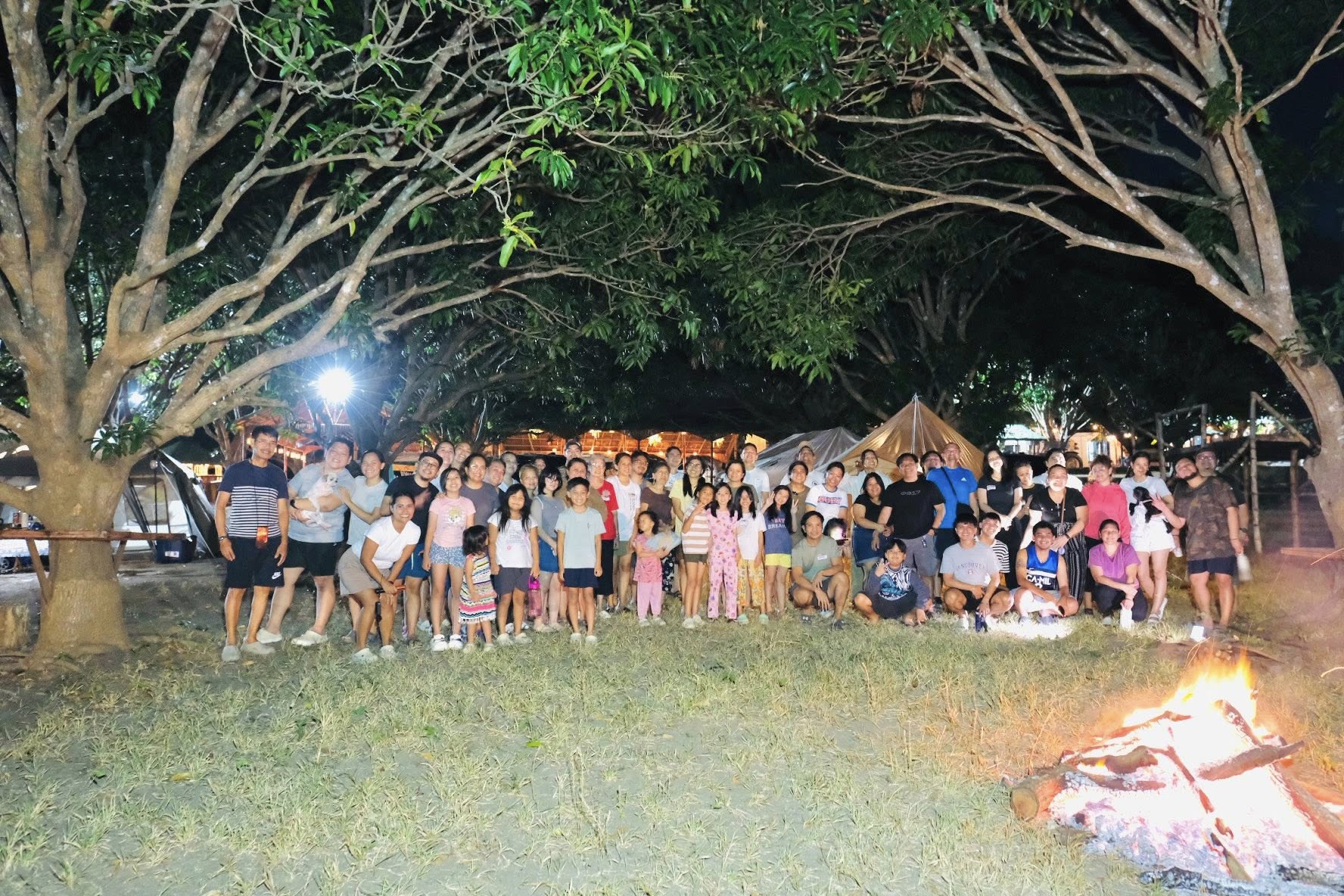 The setting invites all ages — children with wide eyes listening to songs, youth declaring their faith boldly, and adults rediscovering peace in the simplicity of worship outdoors. Each spark that rises to the sky seems to carry prayers upward, and each song echoes across the trees as if creation itself joins in the chorus.