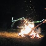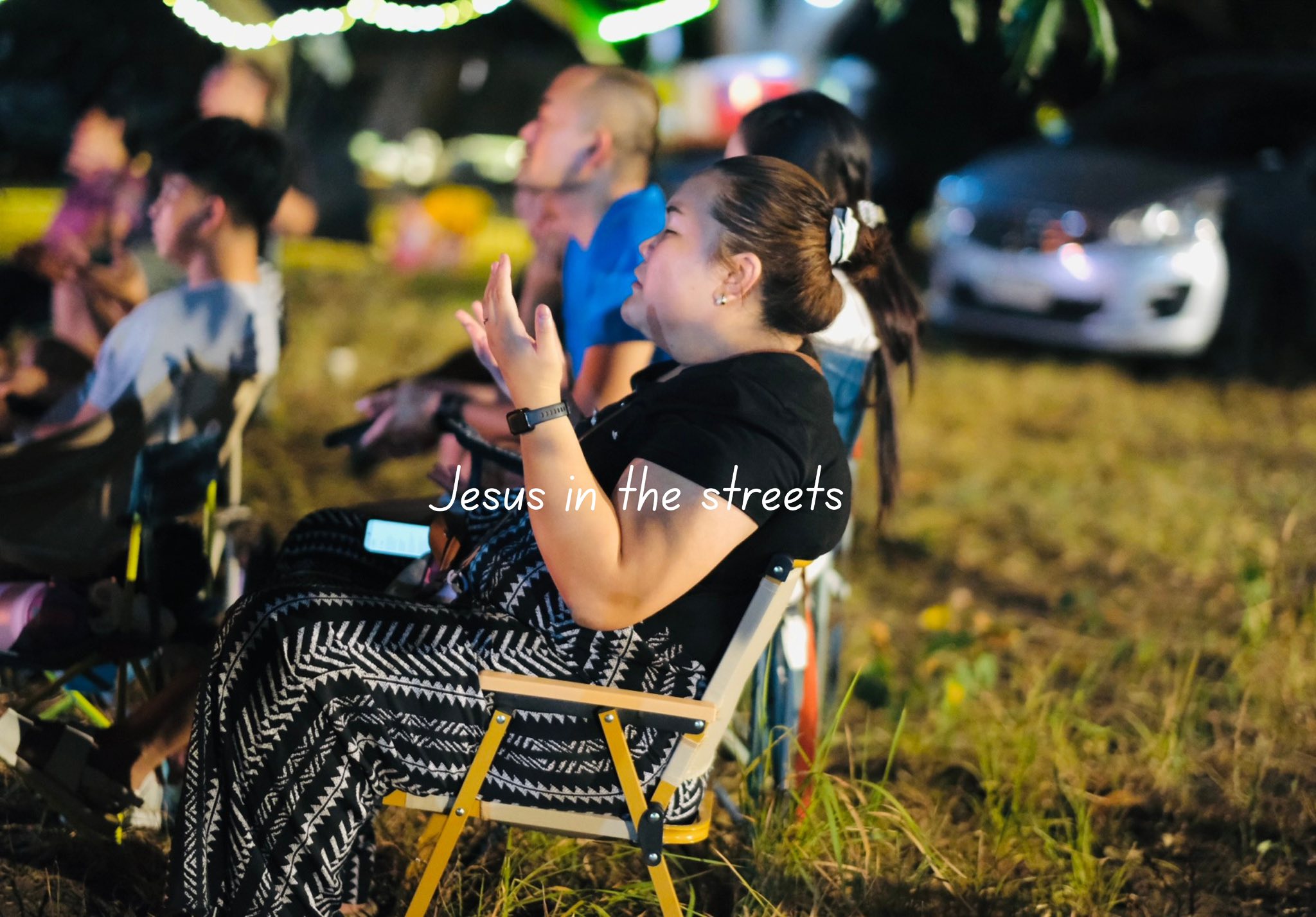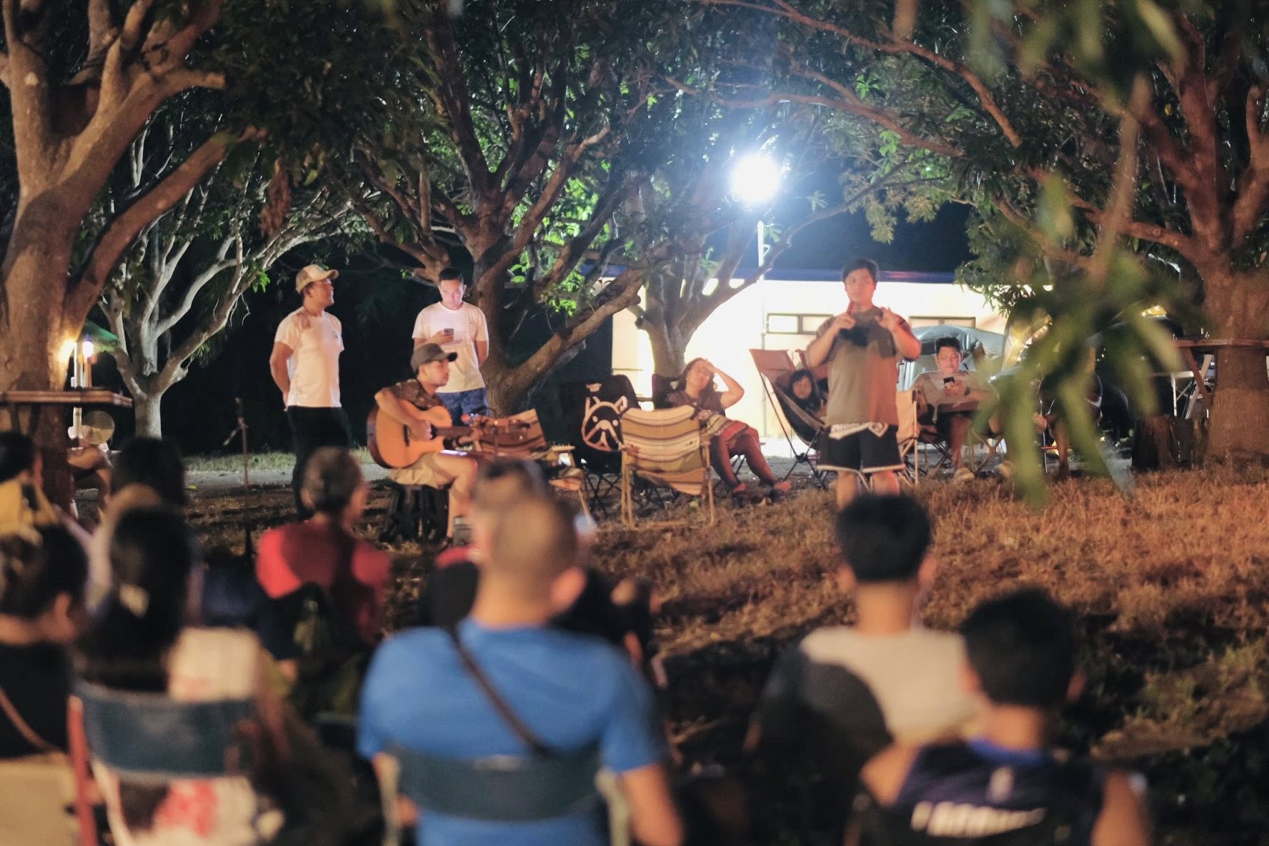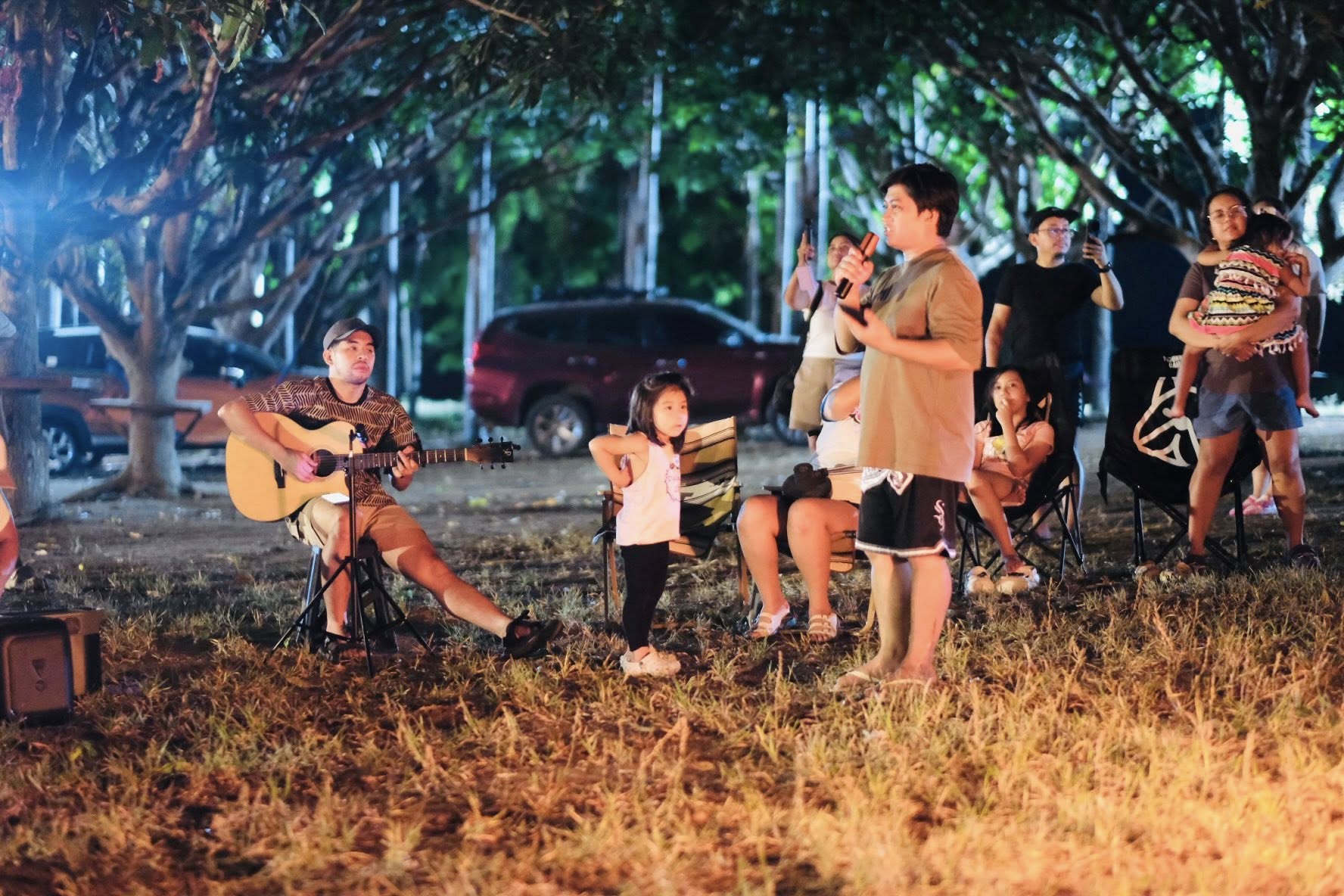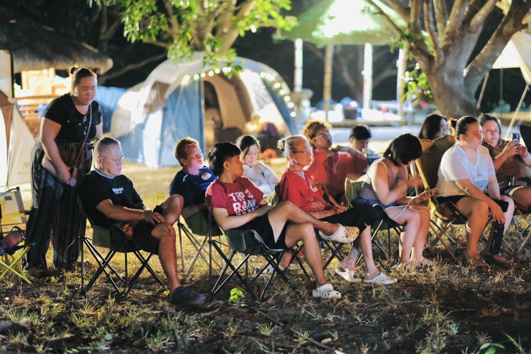 The setting invites all ages — children with wide eyes listening to songs, youth declaring their faith boldly, and adults rediscovering peace in the simplicity of worship outdoors. Each spark that rises to the sky seems to carry prayers upward, and each song echoes across the trees as if creation itself joins in the chorus.